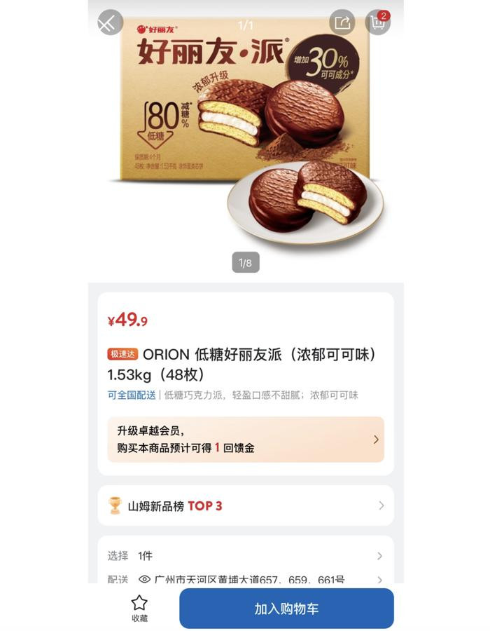 社交媒体上被质疑的“低糖好丽友派”,于今年6月在山姆上新。新品在原有配方上进行了创新,减少了80%的糖分,同时增加了30%的可可含量,售价为49.9元一盒,内含48枚。