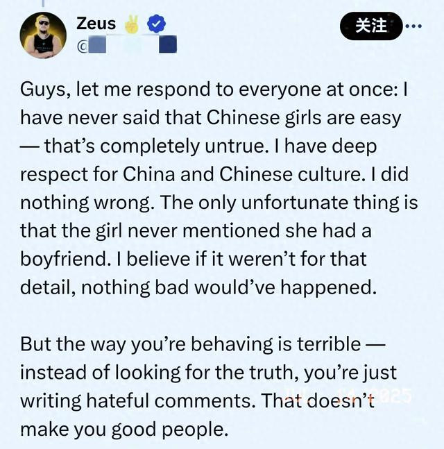 越来越多的网民涌入Zeus的评论区,质问他为何要伤害一个无辜的中国女孩?